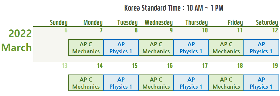 ① 3/21~3/26, 월~토, 오후 2~5시, 총 6회 (학원 현장수업, online 줌수업) ② 3/28~4/2, 월~토, 오후 2~5시, 총 6회 (학원 현장수업, online 줌수업) ③ 4/4~4/9, 월~토, 오후 2~5시, 총 6회 (학원 현장수업, online 줌수업)