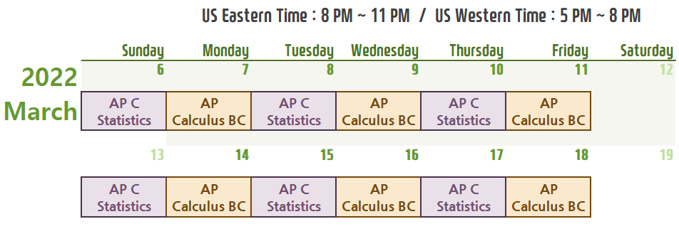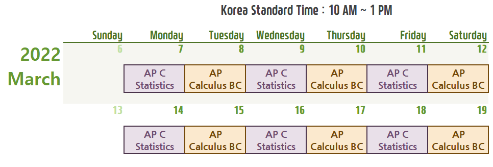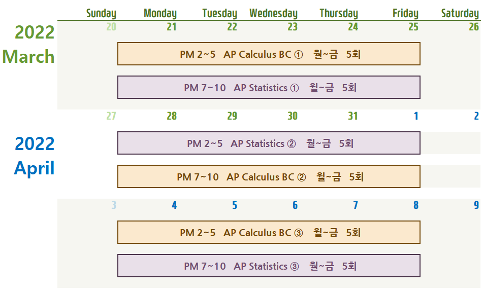 ① 3/21~3/25, 월~금, 오후 2~5시, 총 5회 (학원 현장수업, online 줌수업) ② 3/28~4/1, 월~금, 오후 7~10시, 총 5회 (학원 현장수업, online 줌수업) ③ 4/4~4/8, 월~금, 오후 2~5시, 총 5회 (학원 현장수업, online 줌수업)
