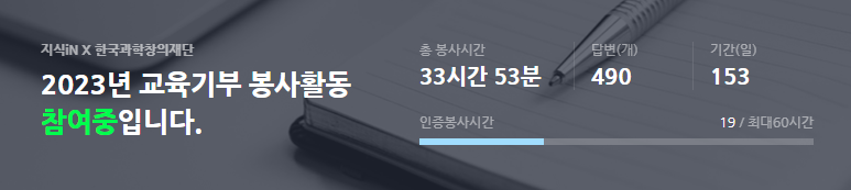 네이버 지식인 교육기부시간도 2022년 60시간을 채웠고(1년 최대 60시간 인정), 2023년에도 현재 총 34시간 정도 채웠습니다. 년말이면 최대 봉사인정 시간 60시간은 무난하게 달성하겠네요.