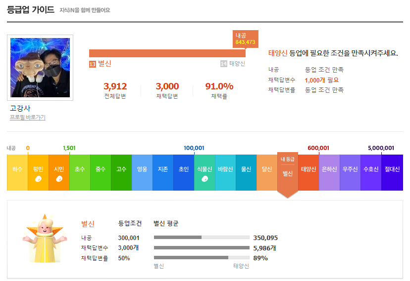 다음 등급인 태양신은 1000개 답변이 채택되어야 하니 등업은 점점 더 힘들어 집니다만 이대로라면 10개월 정도 걸릴 것 같습니다.