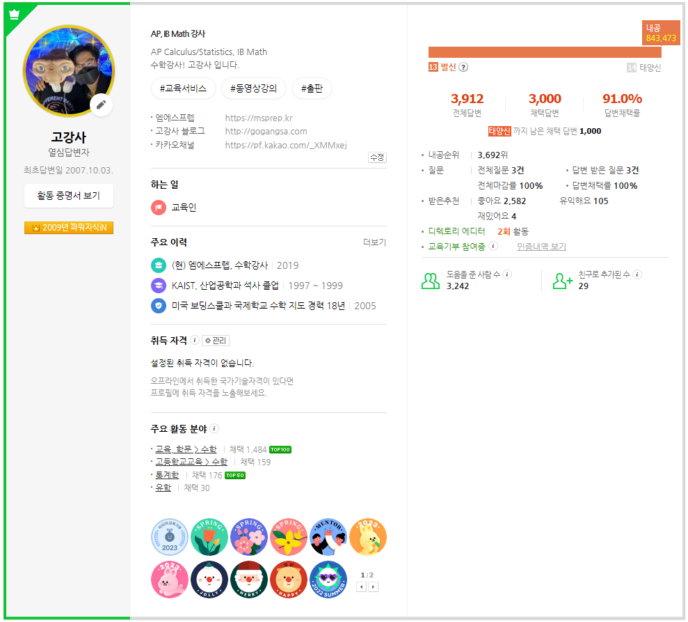 어쨌든 별신이 되면서 확인해 보니, 수학 분야 70위, 통계학 분야 24위 지식인이 되었습니다. 그리고, 이제는 네이버 모든 지식인 중에 4000명 안에 안착(?) 했습니다.
