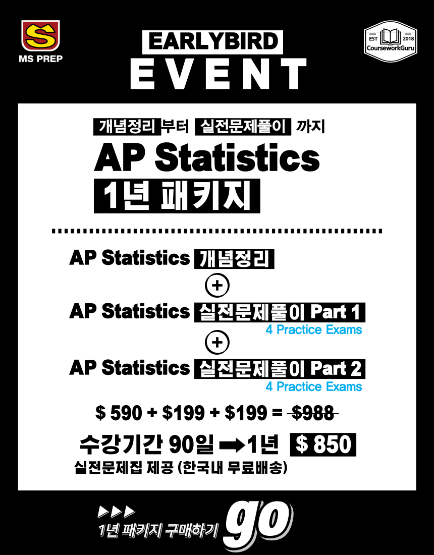 1년 패키지 구입 시 2024 AP Statistics Exam 까지 여유롭게 수강할 수 있습니다.