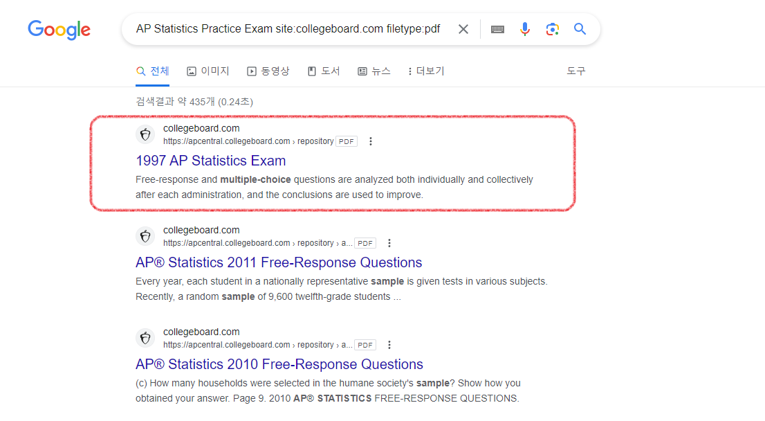 AP Ststistic 의 경우도 비슷한 방법으로 예전 기출문제 중에 공개된 것을 구할 수 있습니다.