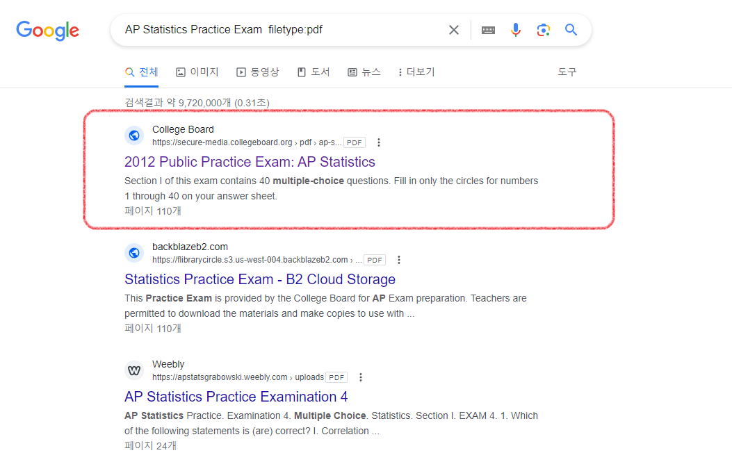 공짜로 AP 시험 기출문제를 구하려면 키워드를 바꿔가면서 구글링을 열심히 해보면 되는데, 사실 상당한 시간과 노력을 들여야 하고, 검색한다고 기출문제가 쉽게 찾아지는 것도 아닙니다. 그래서 제대로 된 자료를 갖고 있는 학원, 선생님을 잘 찾아서 공부하는 것도 고려해보시기 바랍니다.