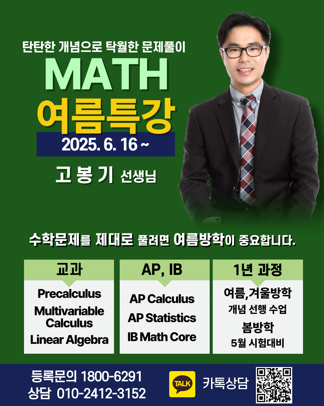 | 2025 겨울방학 - AP Calculus, Statistics 수업 안내 (12/22 개강) (0) | 2025.11.09 |